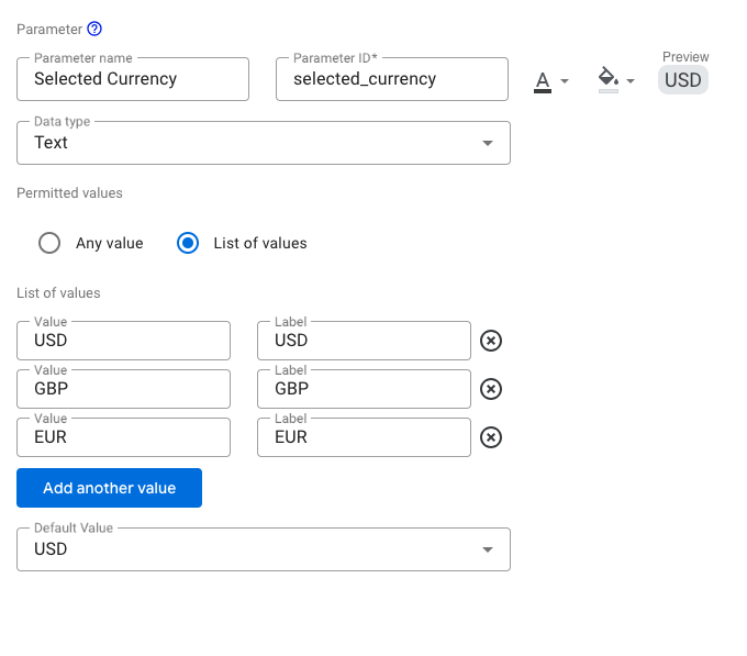 🔧 Step 1: Create a currency selection parameter