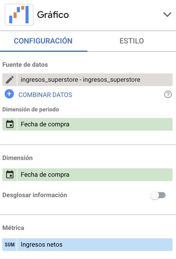 Tras añadir tu gráfico de cascada, en su configuración, elige Fecha de compra como dimensión y como métrica coge Ingresos netos.