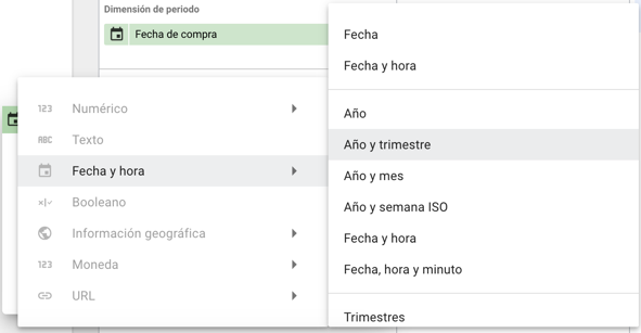 Después cambia el tipo de dato de tu dimensión Fecha de compra a Año y trimestre. Recuerda que puedes cambiarlo haciendo click en el icono junto a Fecha de compra y elegirlo en el desplegable que hay bajo Tipo de datos.