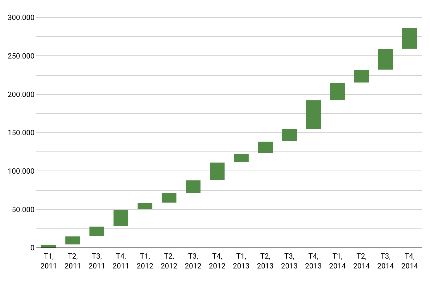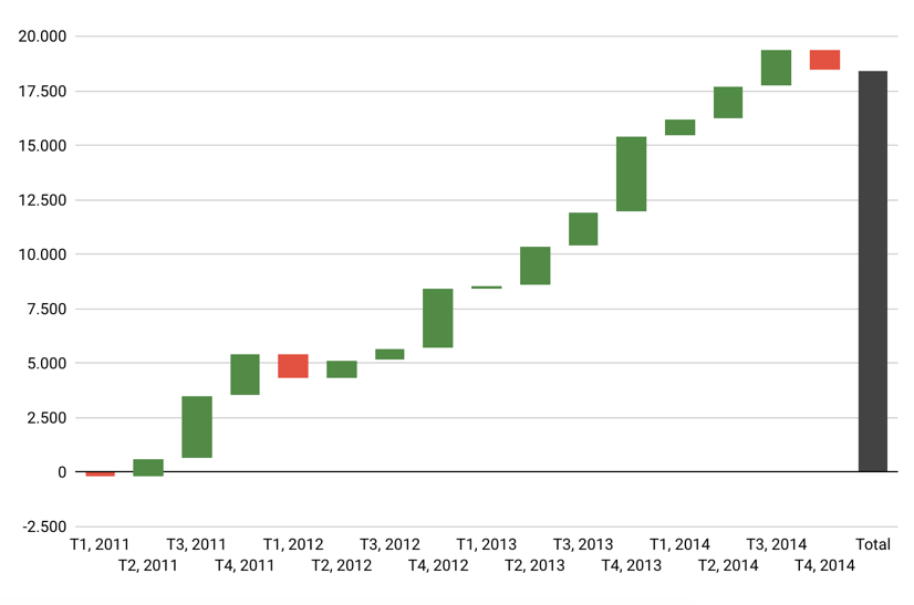 Este tipo de gráfico es una muy buena elección cuando queremos ver la evolución de una métrica desde sus inicios, ya que podemos visualizar cómo las categorías de la dimensión (en este caso trimestres) le han afectado al total.
