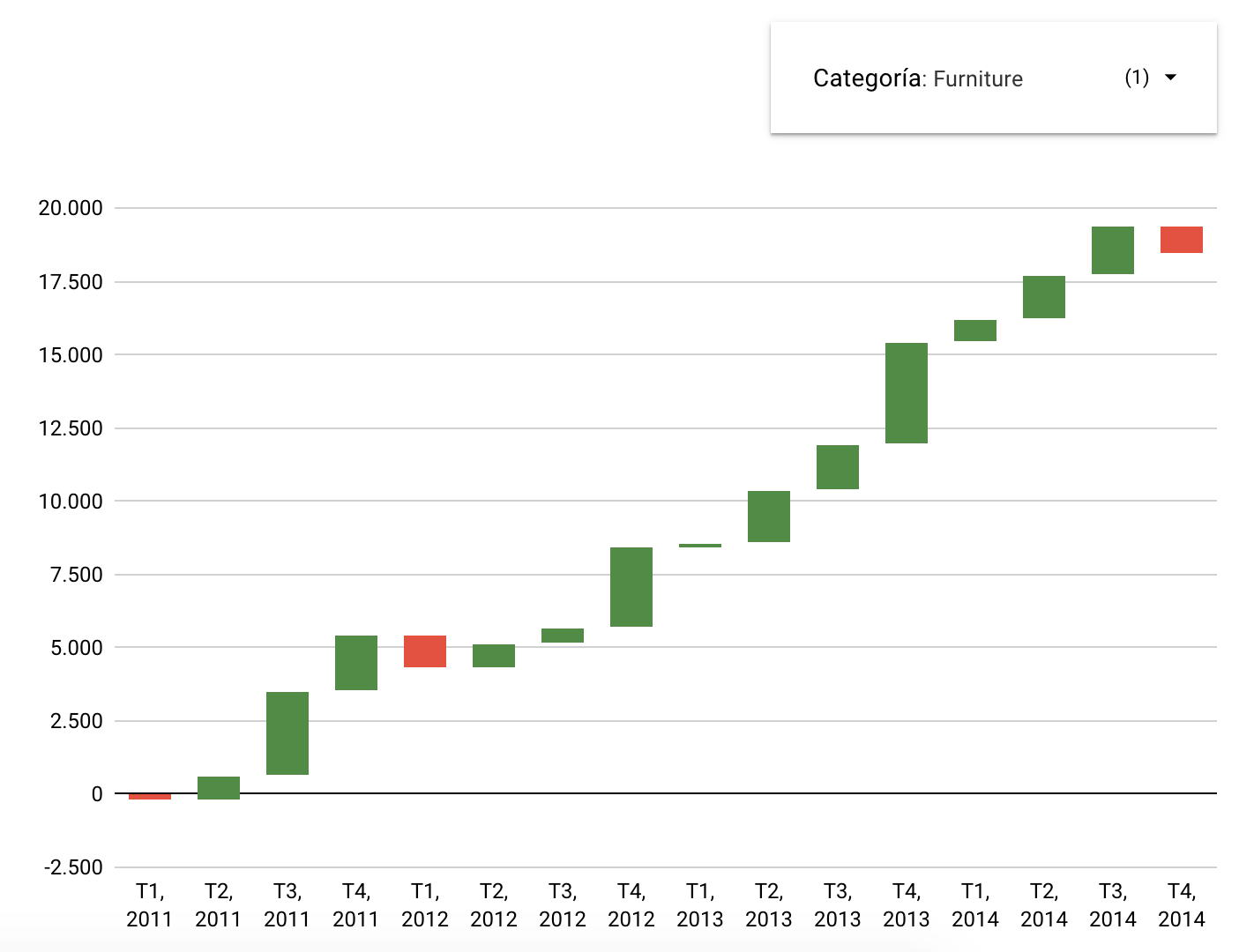 Si estás siguiendo estos pasos, verás que Furniture tiene 3 trimestres en los que las ganancias han sido negativas, por lo que han pasado a representarse en rojo.