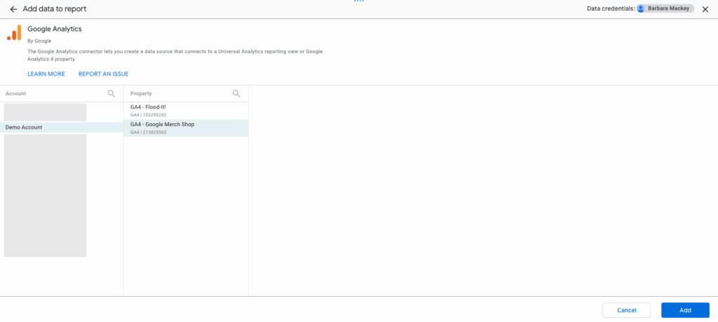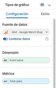 - Añade la fuente de datos: selecciona Google Analytics → GA4 → Google Merchandise Store (demo).