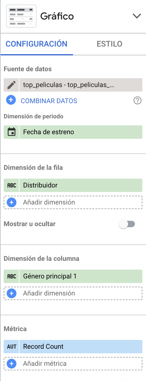 Añade una tabla dinámica y elige Distribuidor como Dimensión de la fila, Género principal 1 como Dimensión de la columna y Record count como la métrica. Puedes visitar el post sobre cómo añadir visualizaciones en Looker Studio si necesitas refrescarte la memoria.