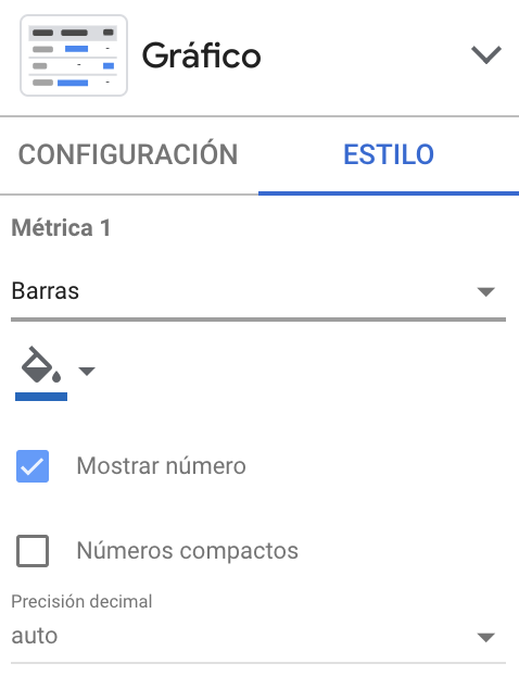 Al igual que las tablas simples, las dinámicas permiten representar las métricas con barras y mapas de calor. Esto puedes configurarlo dentro de Estilo yendo a la columna de la métrica en cuestión. En este caso vamos a elegir representarla con barras y a seleccionar Mostrar número, porque sino aparecen las barras sin el número.