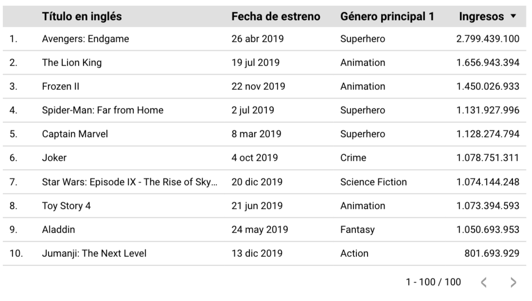 Puedes usar tablas cuando quieras mostrar varias métricas y categorías al mismo tiempo. Por ejemplo, volviendo al dataset de top películas 2019, son una buena opción para ver el nombre de las top 10 películas junto a los ingresos, la fecha de estreno y su género principal. Las tablas son menos visuales, pero permiten mostrar más datos a la vez que muchos otros gráficos. Con otros la información puede terminar muy apretujada y ser muy difícil de leer.