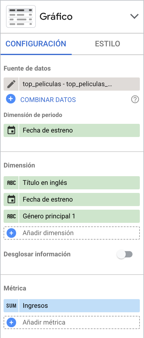 Una vez la hemos añadido, dentro de Configuración, hay que elegir Título en inglés, Fecha de estreno y Género principal 1 como las dimensiones de la tabla, e Ingresos como la métrica.